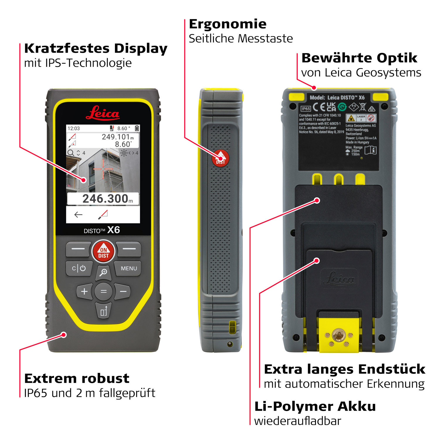 • The extremely robust Leica DISTO™ X6 has been drop tested at 2 m and has IP65 rated protection from dust and water jets.
