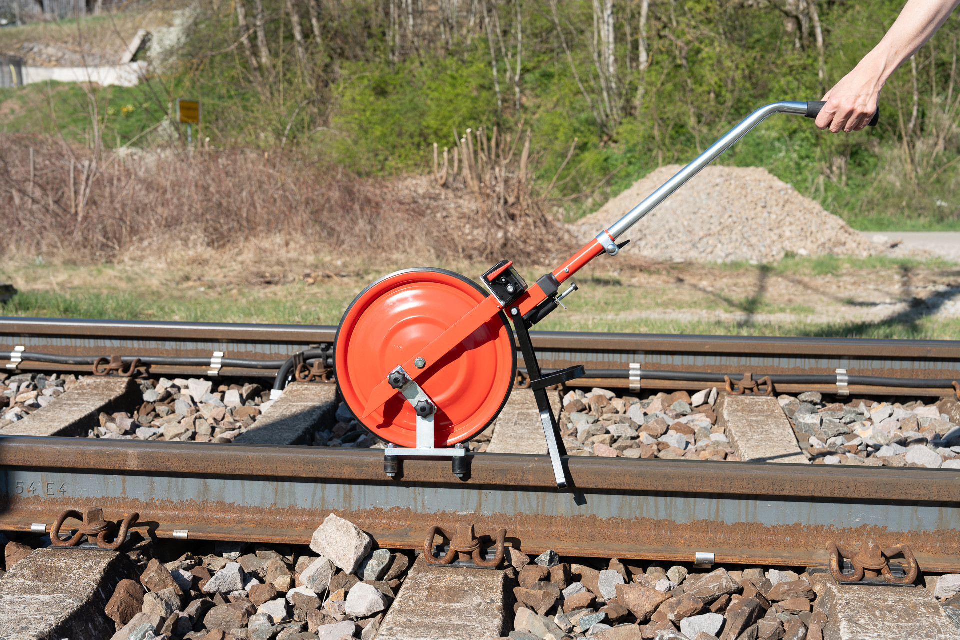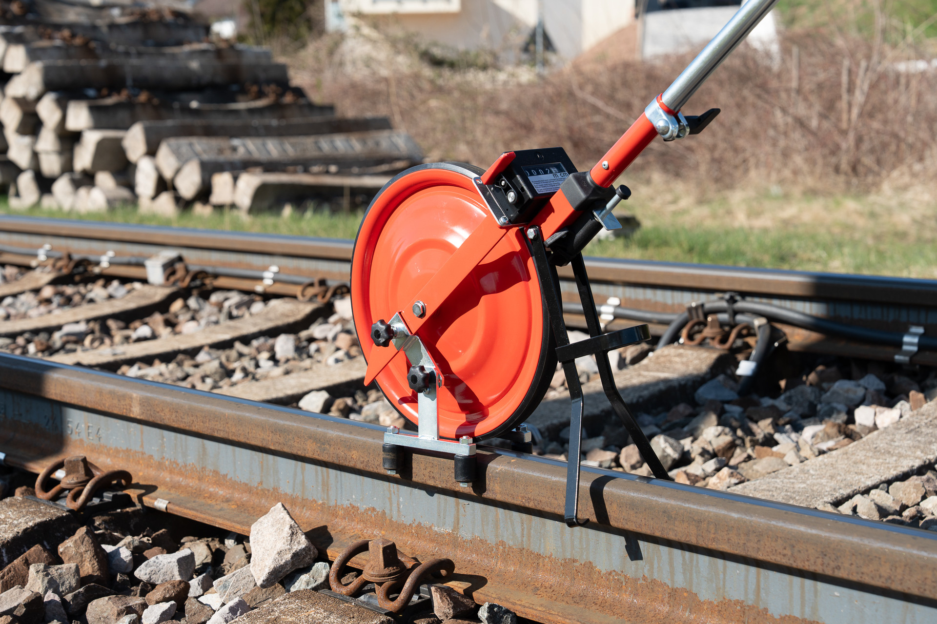 The NESTLE measuring wheel with rail guide is a precise measuring instrument for tracks and rail lines. With a measuring range of up to 9,999.99 m/cm, a wheel diameter of 318.5 mm, a wheel circumference of 1 m and a tolerance of less than 0.02%, it delivers reliable measurement results. The rail guide ensures stable and accurate guidance – even on curved tracks – and can be adjusted to different track radii without tools, as it is foldable and variable. Robust materials and ‘Made in Germany’ quality guarantee durability and precision, ideal for professional track and rail construction.
