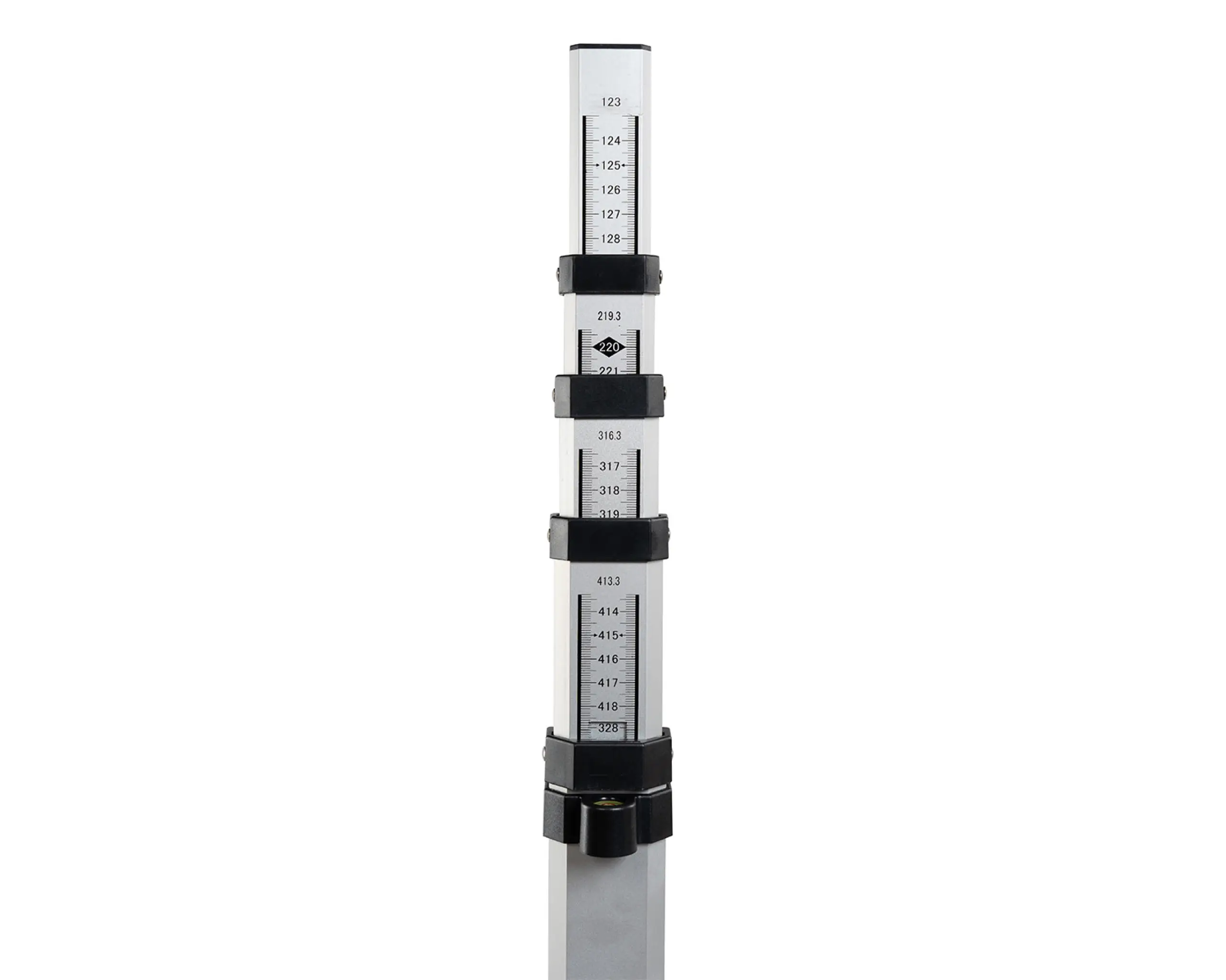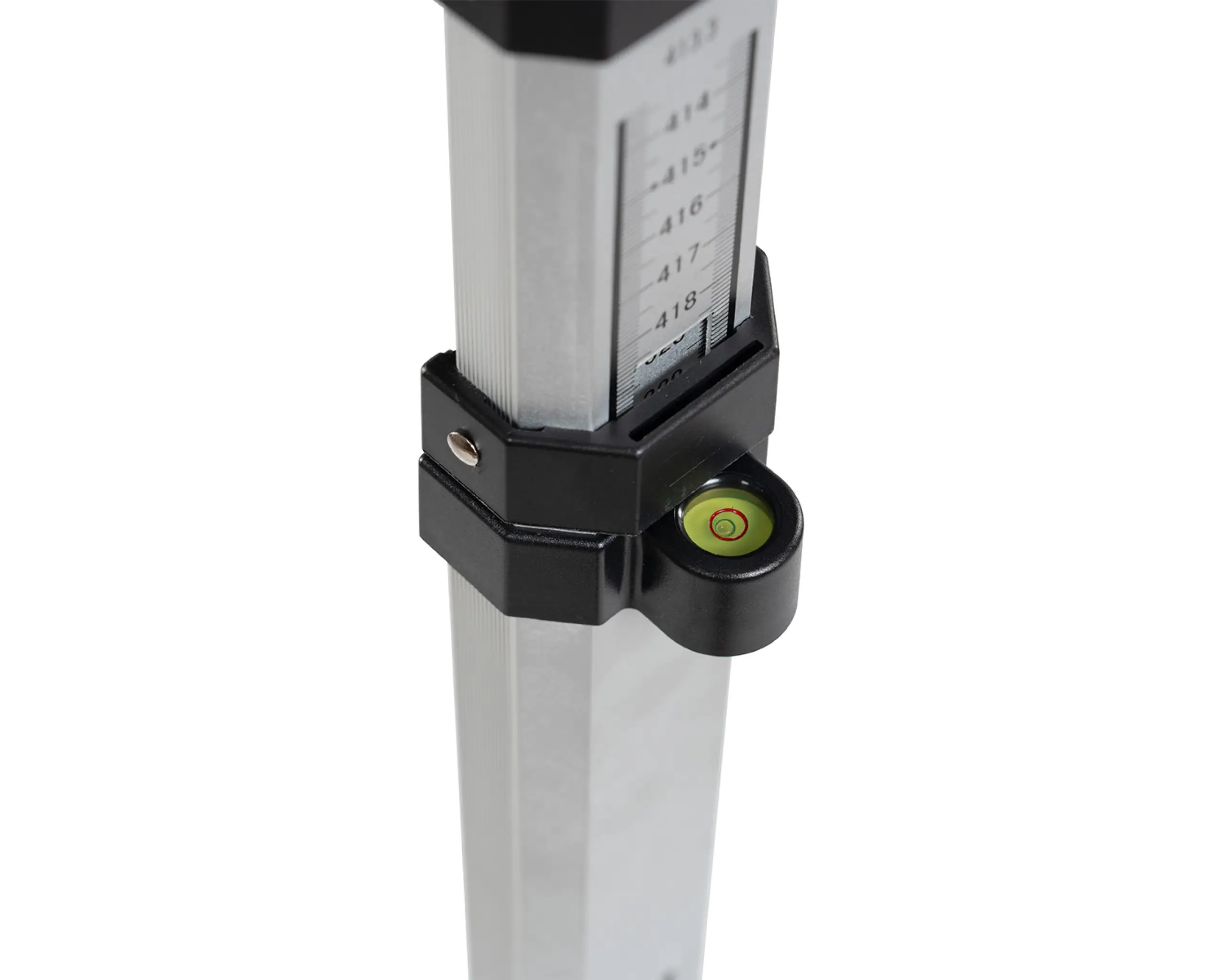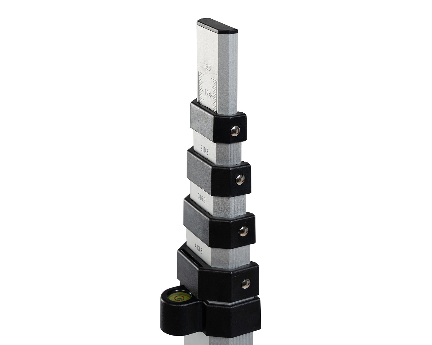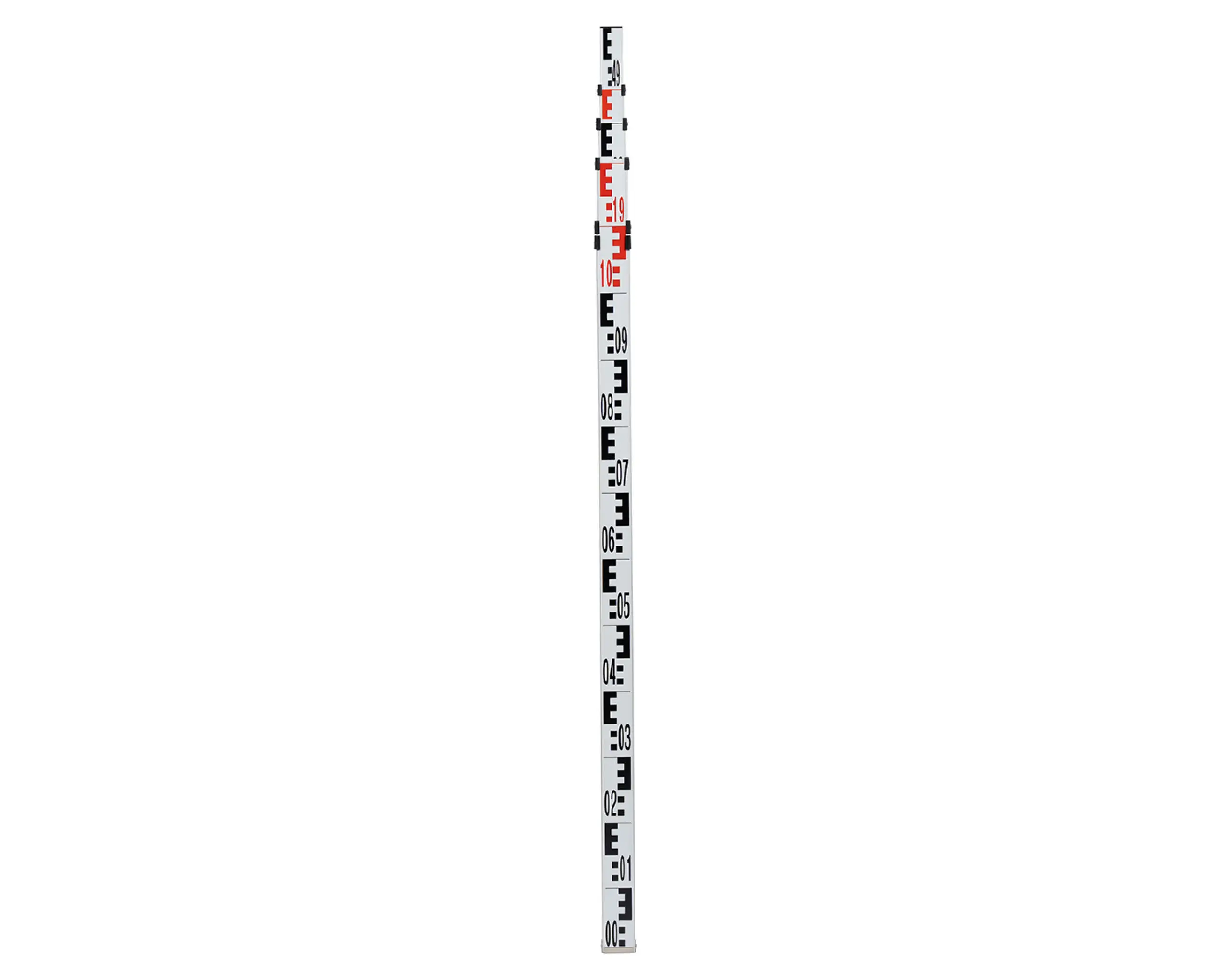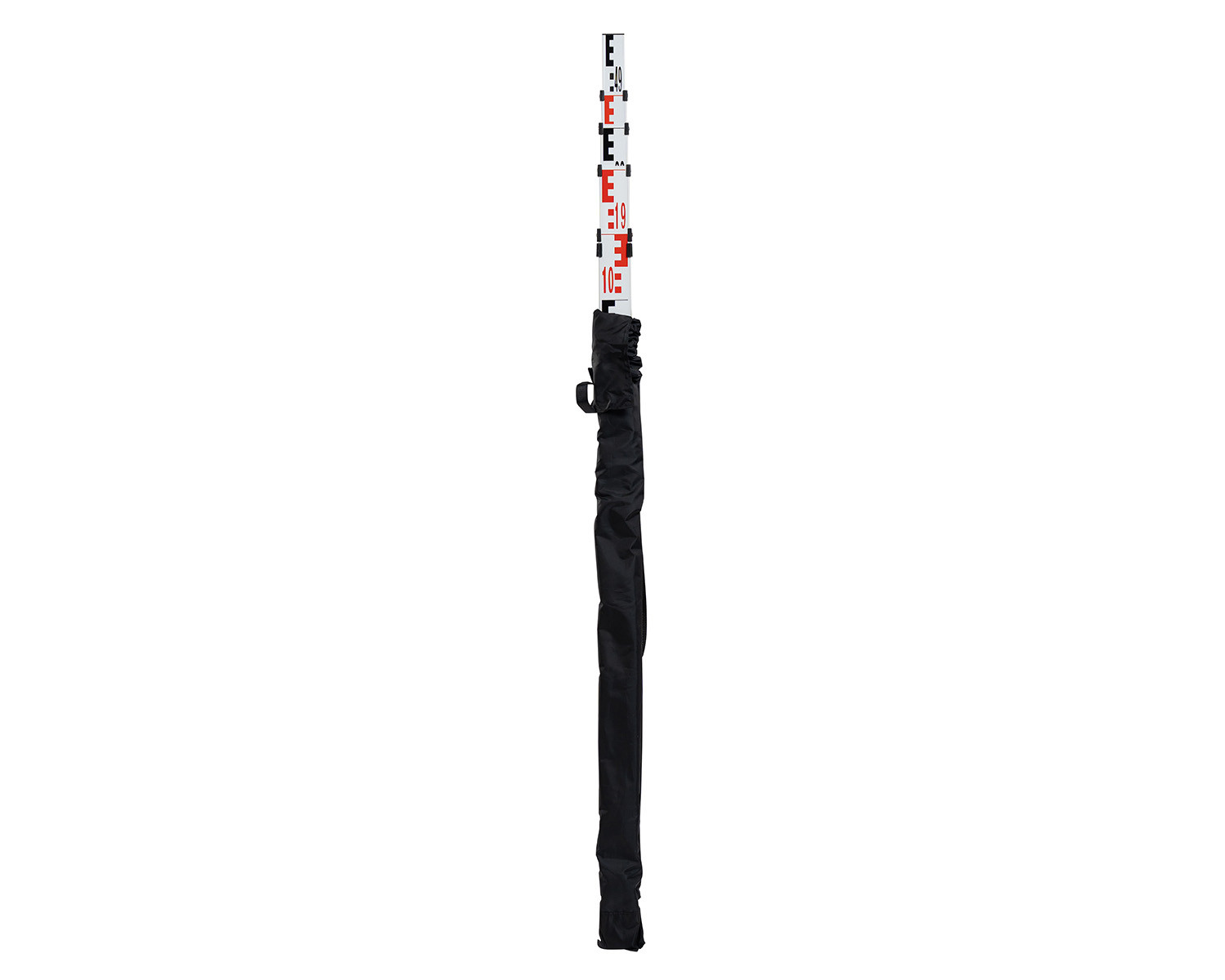 Telescopic levelling staff measuring staffs for levelling including bag and spirit level. This tenimeter can be telescoped up to 5 m and is convenient to transport with its short transport length and low weight. The E graduation on the front with alternating red and white painted metre pieces. Model 18203000 has a mm graduation on the back for measuring clear heights. The telescopic levelling meters are robust and always meet the daily requirements on construction sites. The imprint is protected from abrasion by protruding edges. The stable push-button grid prevents the individual parts from collapsing. Due to the precise guidance of the individual elements, it is smooth-running and does not jam.