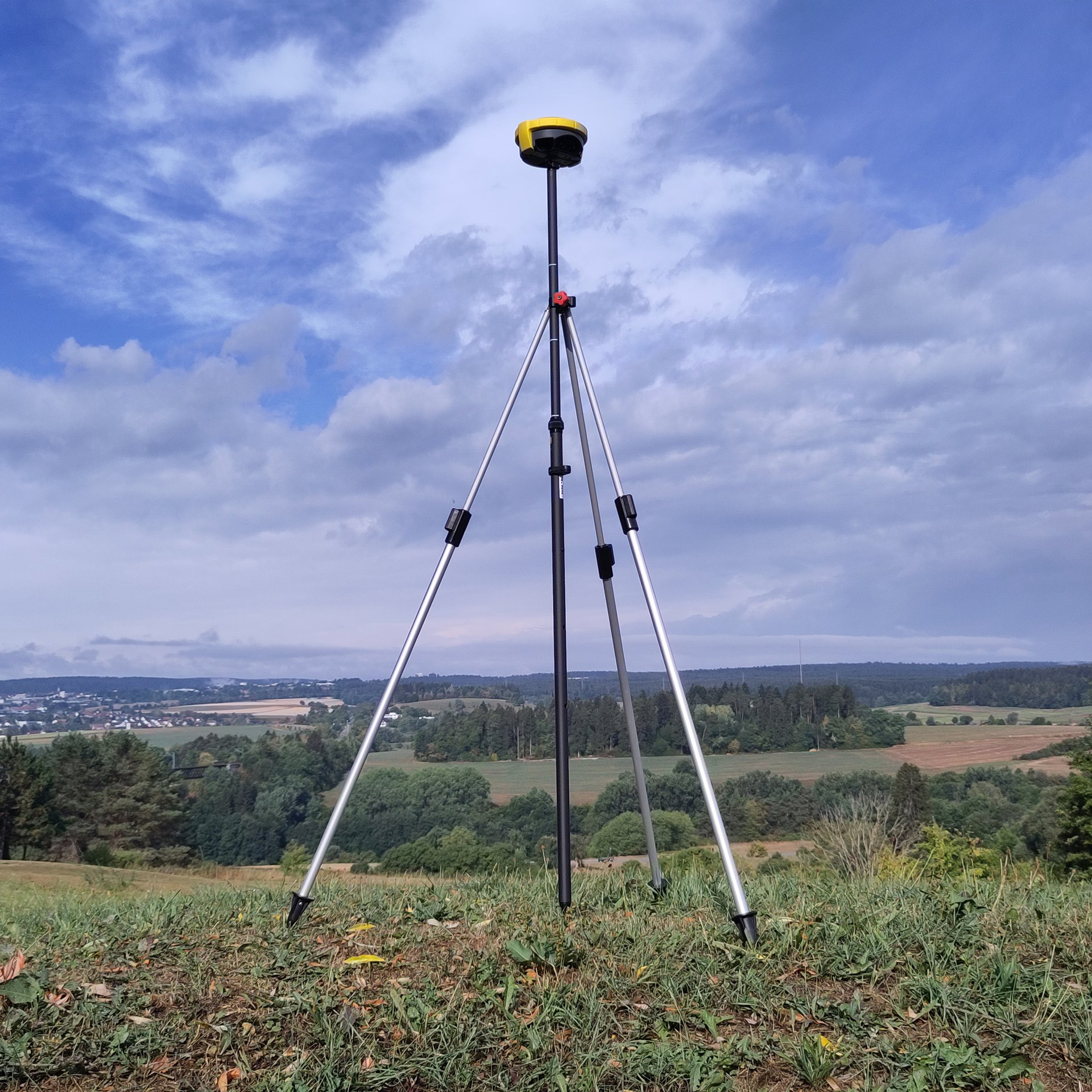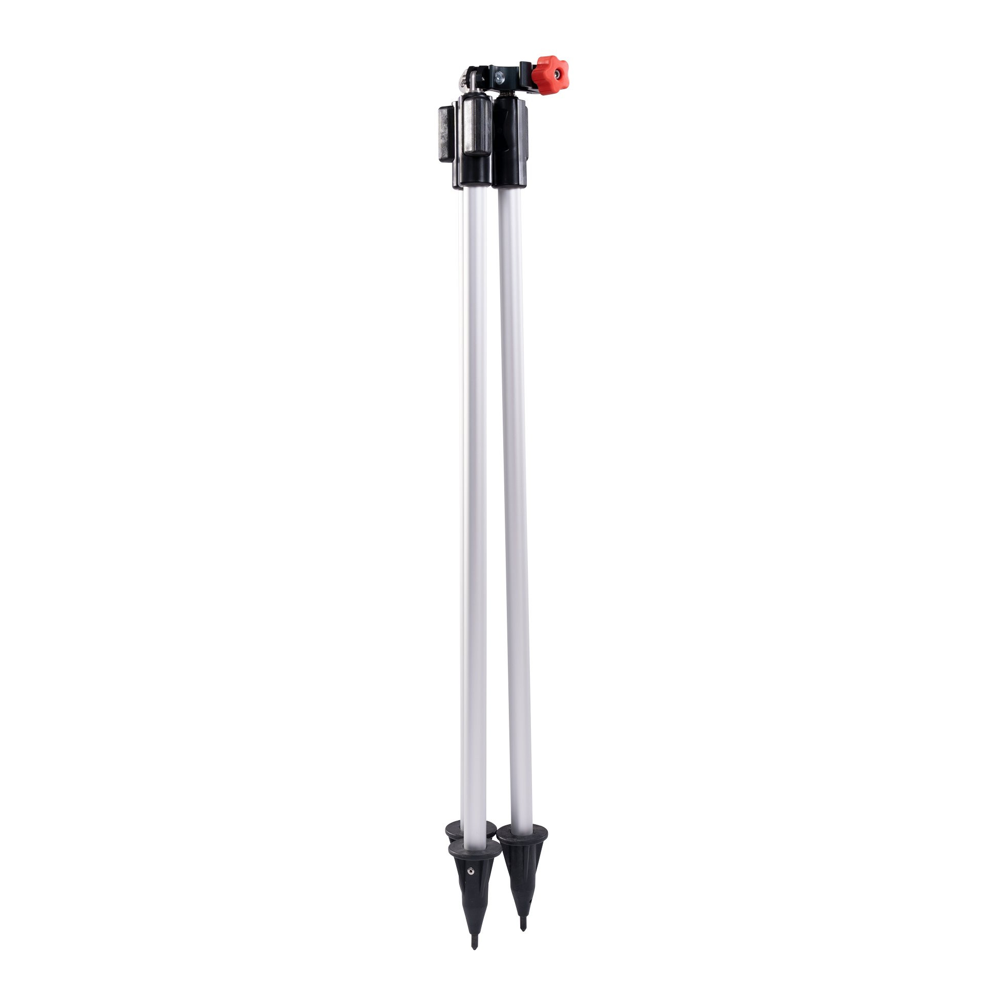 Pour une mise en place facile : fixez le trépied sur la canne - positionnez la pointe de la canne sur le point au sol - ajustez d'abord le niveau de la canne avec deux pieds seulement - déployez enfin le troisième pied --> la canne à prisme et GNSS est stable !