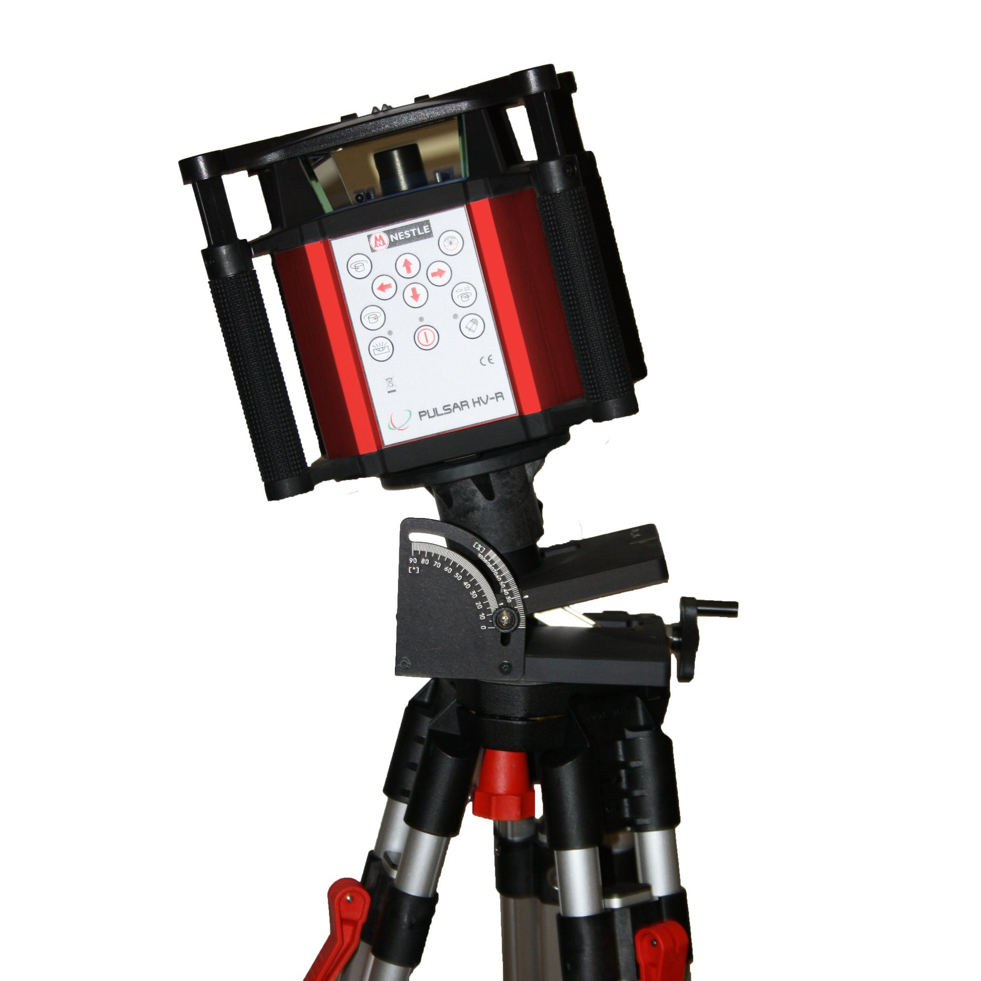 La cale d'inclinaison convient aux lasers à automatisme débrayable. Pour utiliser la cale d'inclinaison, il suffit de remplir trois conditions préalables : Le trépied doit être équipé d'une vis de serrage centrale 5/8" ; le laser doit avoir un filetage 5/8" ; et il doit pouvoir être commuté en mode manuel. Le laser est d'abord monté sur la cale d'inclinaison, puis sur un trépied, et le laser est ensuite commuté en mode manuel. Le réglage de l'inclinaison se fait à l'aide d'une manivelle. L'échelle peut être lue de 0 à 90° et de 0 à 100 %.