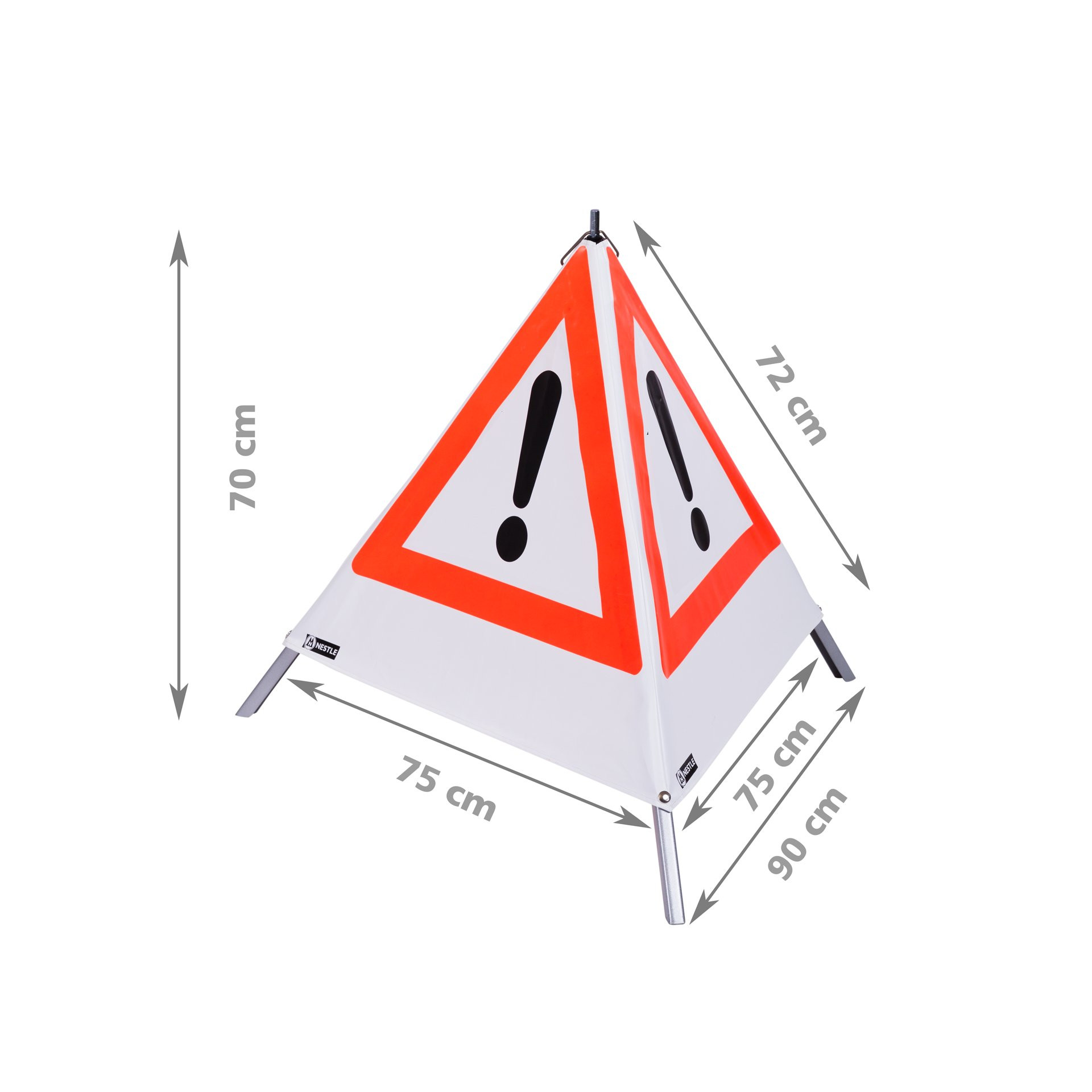 Les triangles de signalisation NESTLE sont idéaux pour sécuriser les lieux d'intervention, les chantiers de construction, les travaux d'arpentage ou pour signaler des situations dangereuses. Grâce à l'aluminium anodisé et en toile plastique PVC, la pyramide d'avertissement résiste à toutes les conditions météorologiques. Les triangles de signalisation sont disponibles en 70 cm ou 90 cm de côté. Ils existent également en version légère avec pied central ou en version lourde avec mécanisme à ressort sans pied central. Le mécanisme à ressort permet un montage et un démontage simples et rapides. Il existe également quatre revêtements différents pour les triangles de signalisation : blanc diurne, blanc rétroréfléchissant, jaune et jaune rétroréfléchissant. Les housses réfléchissantes sont idéales pour une utilisation de nuit et augmentent ainsi votre sécurité. Vous pouvez choisir entre le symbole de danger "Attention" ; (VZ101), "Homme à la pelle" ; (VZ123) et "Interdiction de fumer" ; pour les housses. En outre, plus de 200 inscriptions individuelles sont disponibles pour indiquer de manière ciblée la nature du danger.