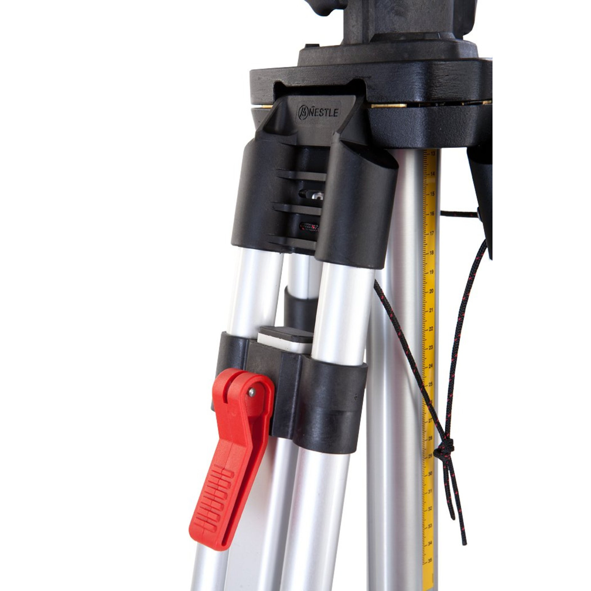 Le modèle 13402000 est doté d'un double serrage latéral pour une force de serrage maximale. Le système de serrage latéral breveté agit dans le sens de la force sans la dévier. Le double serrage minimise le jeu du trépied, ce qui est idéal pour les hauteurs de travail importantes.