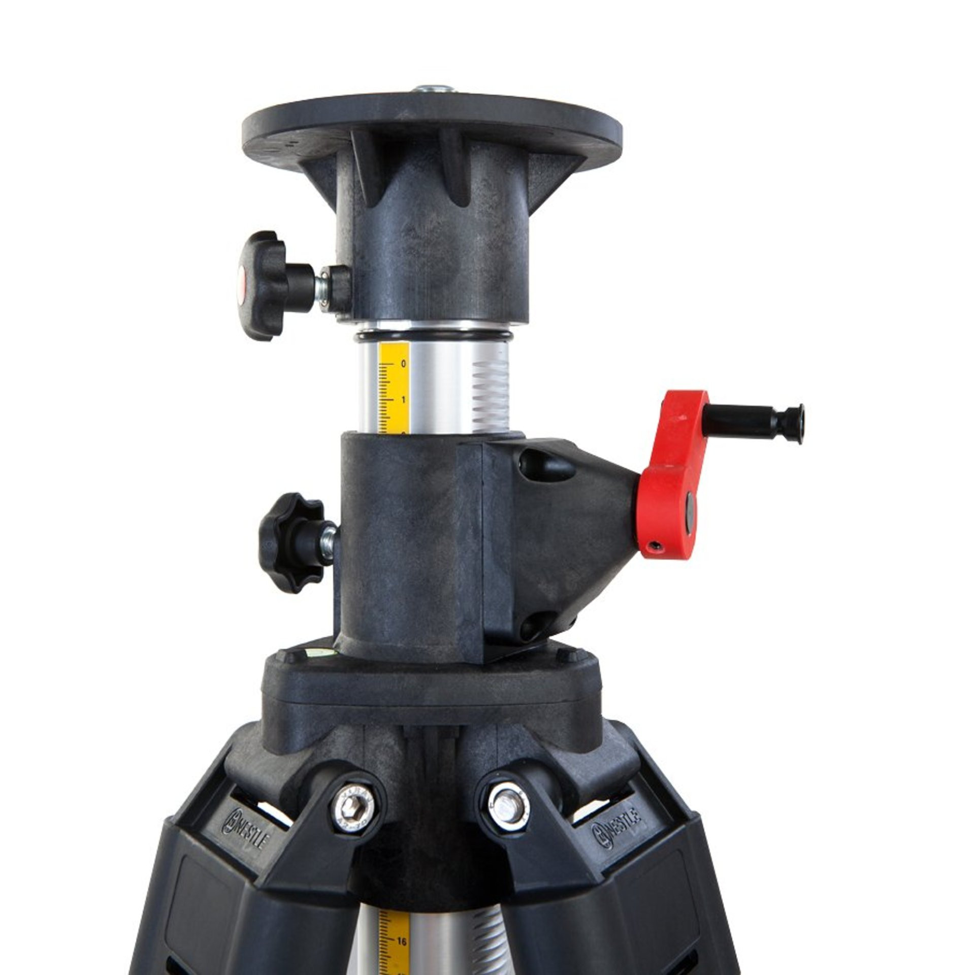 La course de manivelle de 35 cm permet d'atteindre très précisément une hauteur donnée. Grâce à la double réduction (course de manivelle de 1,2 cm par tour), la manivelle peut être déplacée confortablement même avec des appareils laser lourds.
