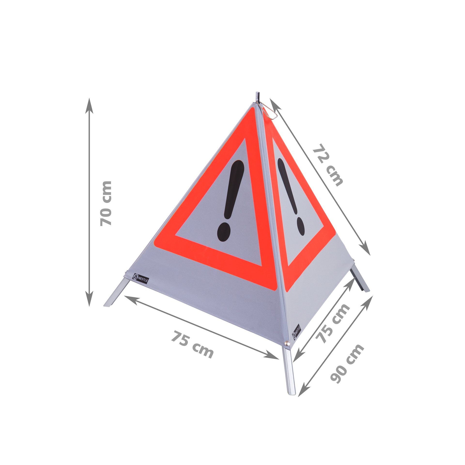 Die NESTLE Warnpyramiden eignen sich bestens zur Absicherung von Einsatzstellen, an Baustellen, bei Vermessungsarbeiten oder als Hinweis auf Die NESTLE Warnpyramiden eignen sich bestens zur Absicherung von Einsatzstellen, an Baustellen, bei Vermessungsarbeiten oder als Hinweis auf Gefahrensituationen. Durch eloxiertes Aluminium und PVC-Kunststoffgewebe trotzt die Warnpyramide allen Wetterbedingungen. Die Warnpyramiden sind in 70 cm oder 90 cm Seitenlänge erhältlich. Zudem als leichte Ausführung mit Mittelfuß, oder als schwere Ausführung mit Federmechanismus ohne Mittelfuß. Der Federmechanismus ermöglicht ein einfaches und schnelles Auf- und Abbauen. Des weiteren gibt es vier unterschiedliche Bezüge für die Warnpyramiden: weiß tagesleuchtend, weiß retroreflektierend, gelb und gelb retroreflektierend. Die reflektierenden Bezüge eignen sich hervorragend für den Nachteinsatz und erhöhen so Ihre Sicherheit. Sie können bei den Bezügen zwischen Gefahrensymbol "Achtung" (VZ101), "Schaufelmann" (VZ123) und "Rauchverbot" wählen. Zusätzlich stehen über 200 individuelle Aufschriften zur Auswahl, die gezielt auf die Art der Gefahr hinweisen.