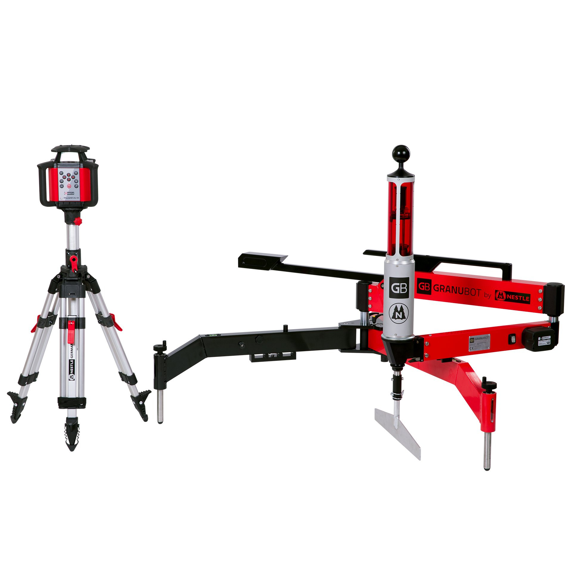 Das Granubot SET beinhaltet zusätzlich den Rotationslaser Pulsar HV-R sowie ein Kurbelstativ mit Gummifüßen.