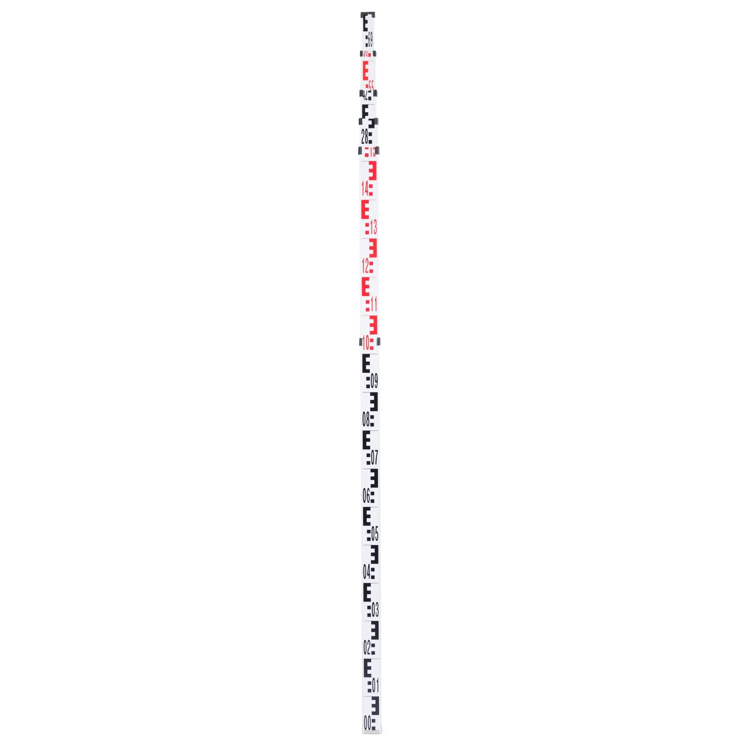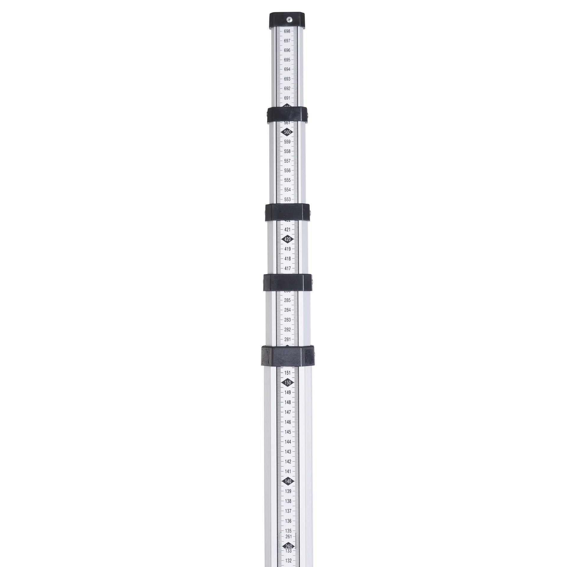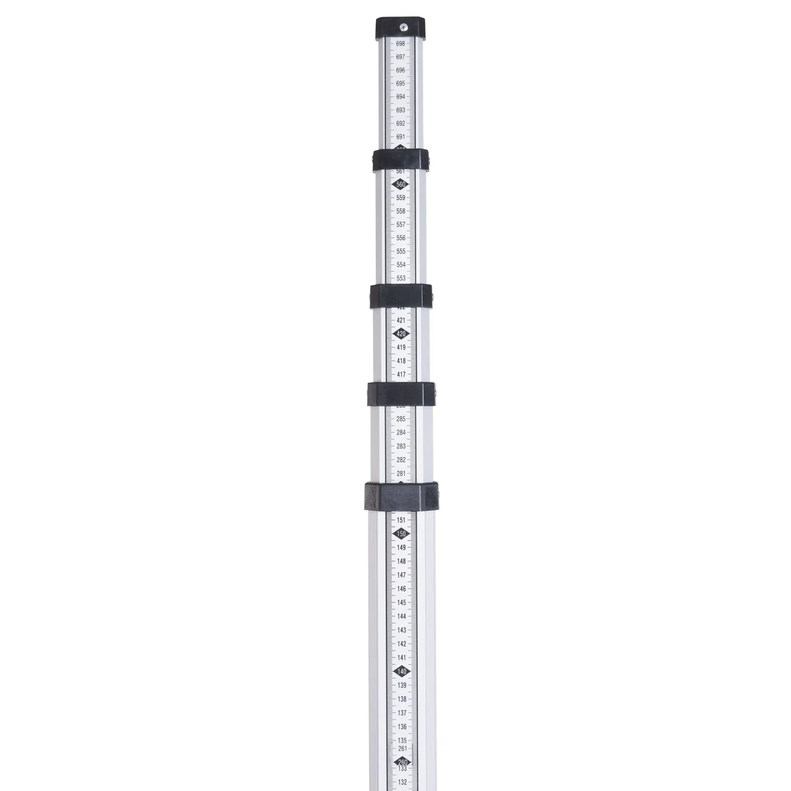 Teleskopnivelliermeter-Messlatten für Nivellements inklusive Tasche und Libelle. Dieser Tenimeter ist bis 7 m teleskopartig ausziehbar und mit der geringen Transportlänge und dem niedrigen Gewicht bequem zu transportieren. Die E-Teilung auf der Vorderseite mit abwechselnd rot und weiß lackierten Meterstücken. Das Modell 18206000 hat auf der Rückseite eine durchgehende mm-Teilung, von unten mit 0 beginnend. Die Teleskop-Nivelliermeter sind robust und werden den täglichen Anforderungen auf Baustellen jederzeit gerecht. Der Aufdruck ist durch überstehende Kanten vor Abrieb geschützt. Die stabile Druckknopfrasterung verhindert ein zusammensacken der Einzelteile. Durch die genaue Führung der einzelnen Elemente ist es leichtgängig und verkantet nicht.